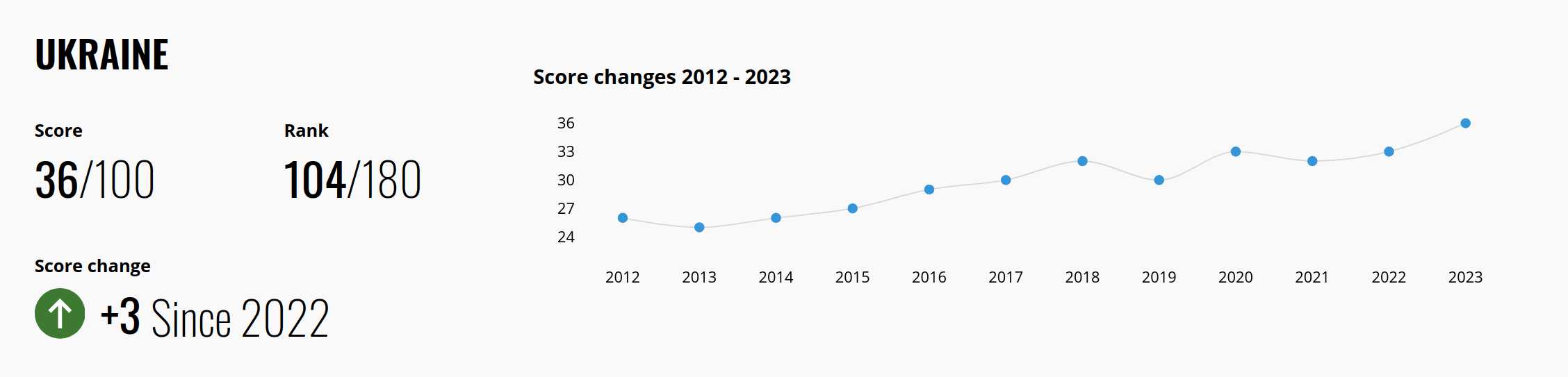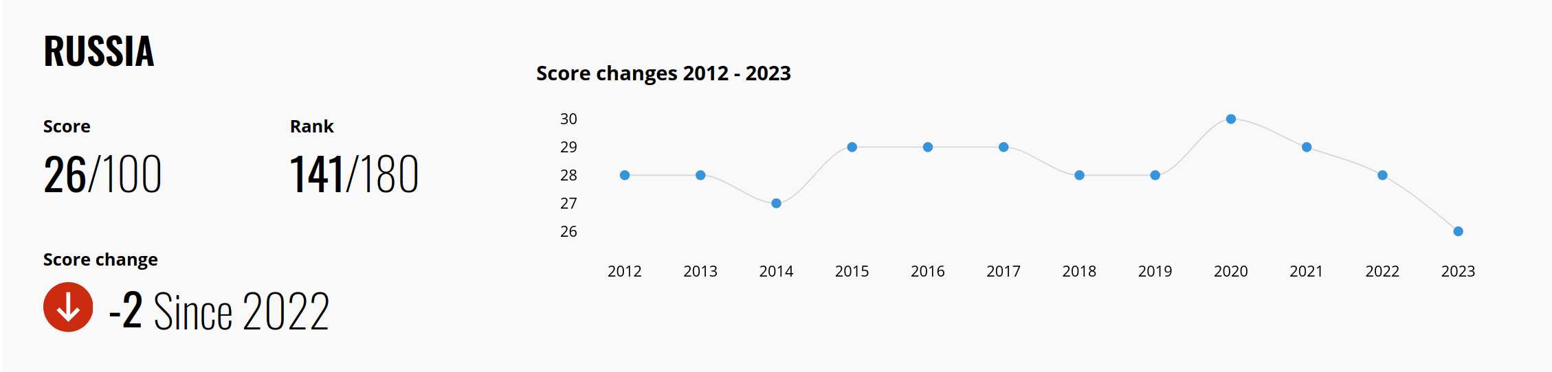 According to the 2023 Corruption Perceptions Index1 reported by Transparency International, Russia is ranked as the 141st most corrupt nation out of 180 countries, having dropped 2 places compared to the previous year. The Index indicates that the situation has been steadily deteriorating since 2020.