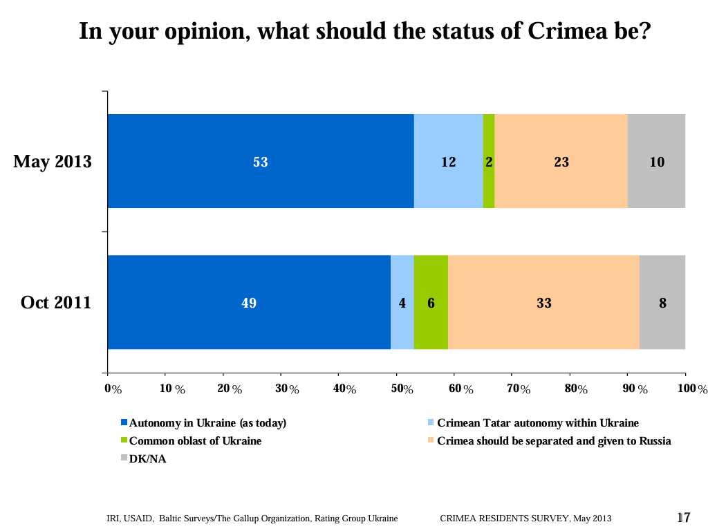 A poll by the International Republican Institute in May 2013 found that 53% of the residents of Crimea wanted to stay “Autonomy within Ukraine,” 12% were for “Crimean Tatar autonomy within Ukraine,” 2% for “Common oblast of Ukraine,” and 23% voted for “Crimea should be separated and given to Russia.”9